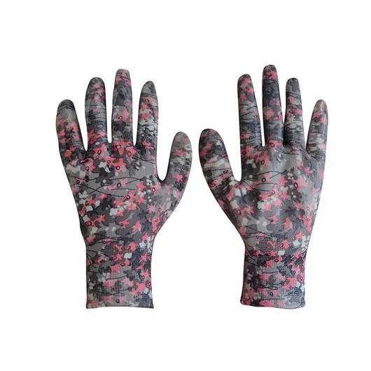 cheap safety work gloves floral PU coated smooth gloves13 gauge knitted liner